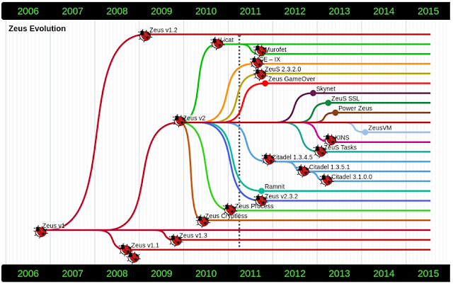 Now that we are through with all the technical stuff, we can move on to some fun stuff. One of the things i like about this vulnerability is its stealthy nature. It enable it to survive throughout almost all Zeus development cycles. So for this i prepared the following Zeus evolution graph that demonstrate the vulnerability survival journey
